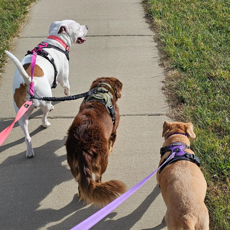 "This leash is a lifesaver! No more tangled leashes when walking my two dogs. The swivel works perfectly, and the bungee helps with pulling!"